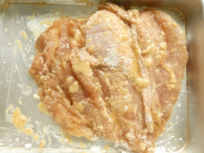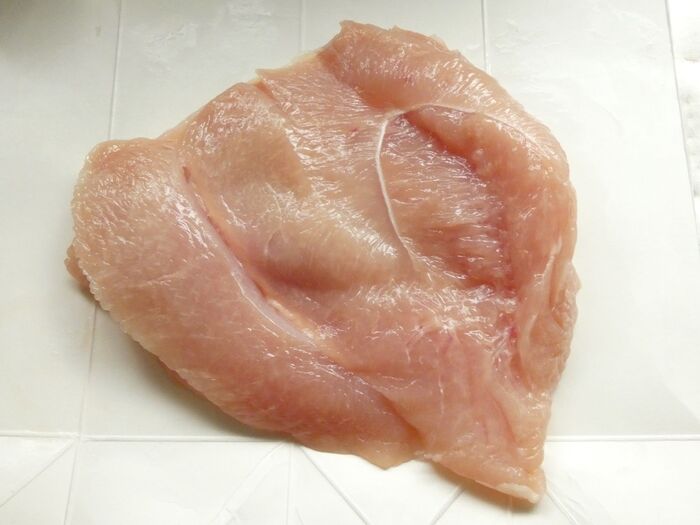 鶏胸肉は観音開きにして厚さを薄めに均一にします。