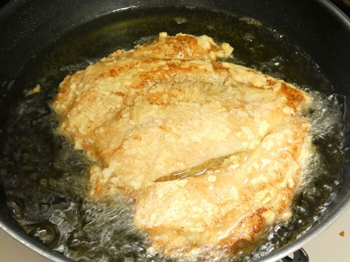 大きめのフライパンに油を入れ、中温くらいで揚げます。