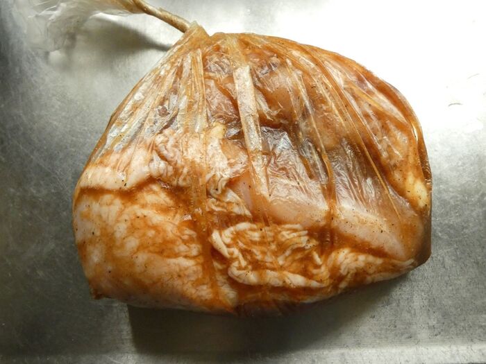 ★印の調味料をポリ袋に入れて混ぜ合わせ、鶏胸肉を入れて1時間くらい漬け込みます。