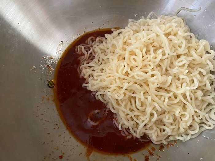ボウルに コチュジャン ごま油 インスタントラーメンの粉末スープ 水を加えよく混ぜ合わせる