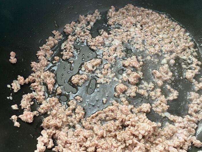 フライパンにごま油を入れ、にんにくと豚ひき肉を炒めて色が変わったら分量の塩をひとつまみ加える