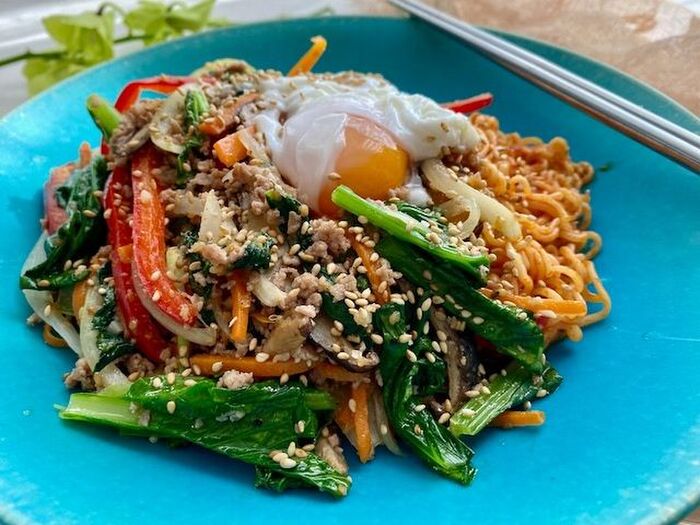 器にラーメンを盛り付け 炒めた野菜と温玉をのせ白ごま(分量外)をふる