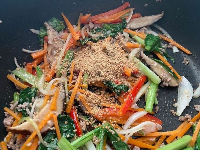 火の通りにくい野菜 人参 しいたけ 玉ねぎ 小松菜の茎の順に加え小松菜の葉っぱとパプリカを入れて炒めたら すりごまと残りの塩で味を調える