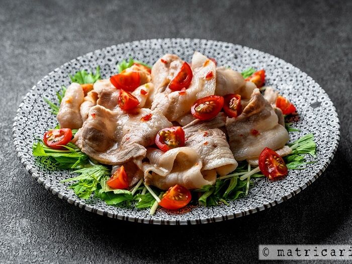 お皿に水菜をしき、ソースと和えた豚肉をのせ、1/4にカットしたミニトマトをのっけたら完成!