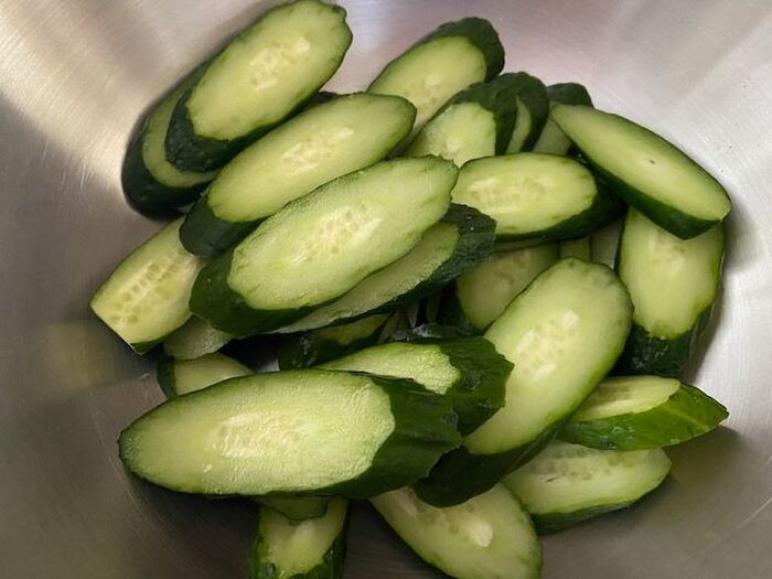きゅうりは5mm幅の斜め切りにして 塩をふり2〜3分おいてから軽く洗い流し水気を切る