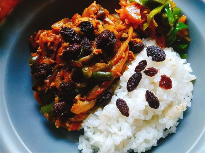 皿にカレーを盛りつけたらレーズンを散らして。