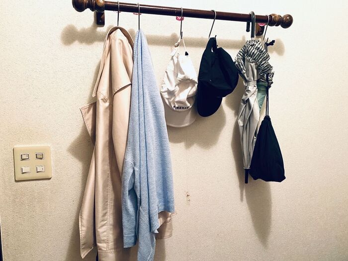 玄関のカーテンレールで作ったコート掛けに、フックをつけて収納しています。