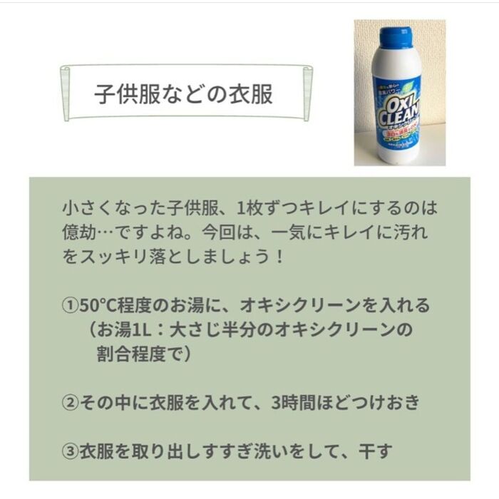 洗濯表示、オキシクリーン(酸素系漂白剤)の説明書など確認してから行いましょう。