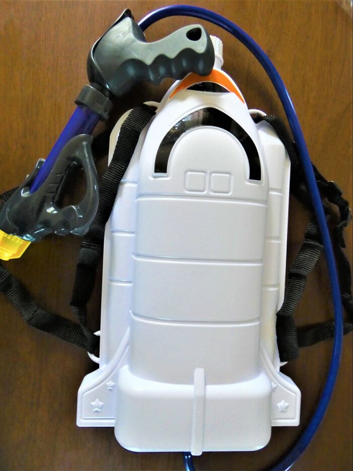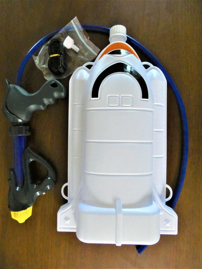 子供でも操作しやすく、1年生の三男が背負うと亀の甲羅みたいです。本人も水遊びが楽しくて、タンクの重さも気にならない様子!!