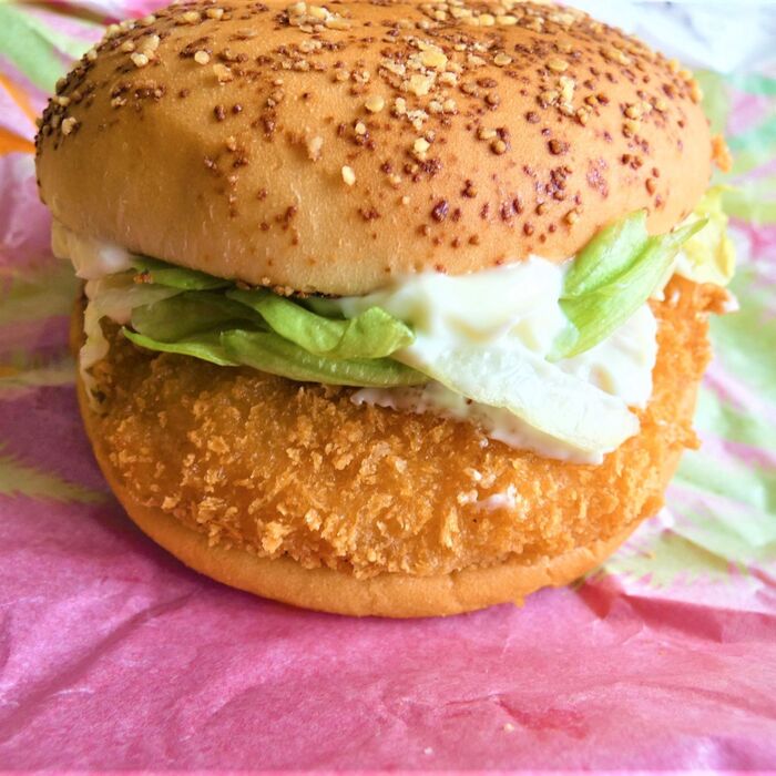粉チーズをトッピングしたバンズの中に、ザクザク衣とぷりぷりの海老かつ・シャキシャキレタスにサクサク食感のフライドガーリック・スパイシーなソースが合う!