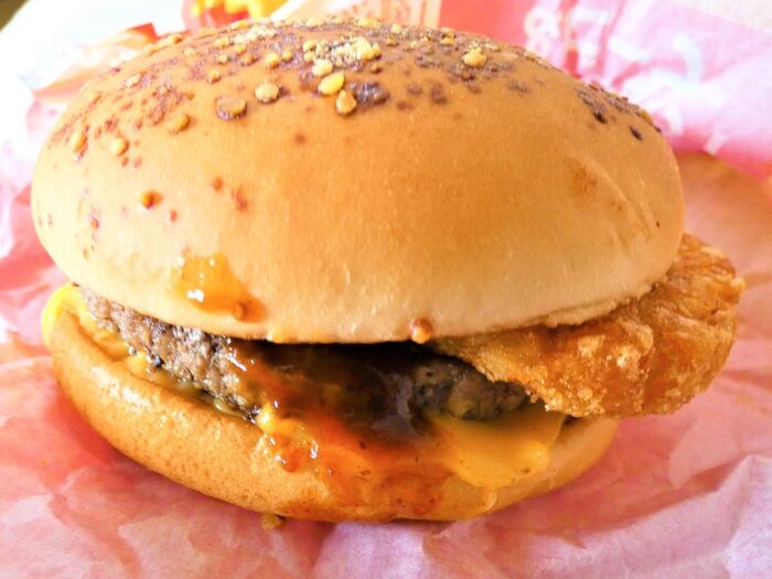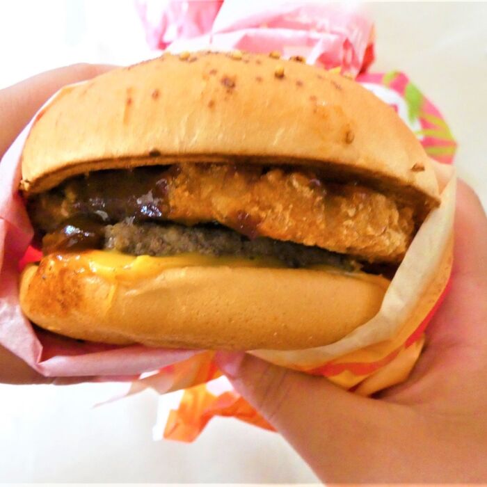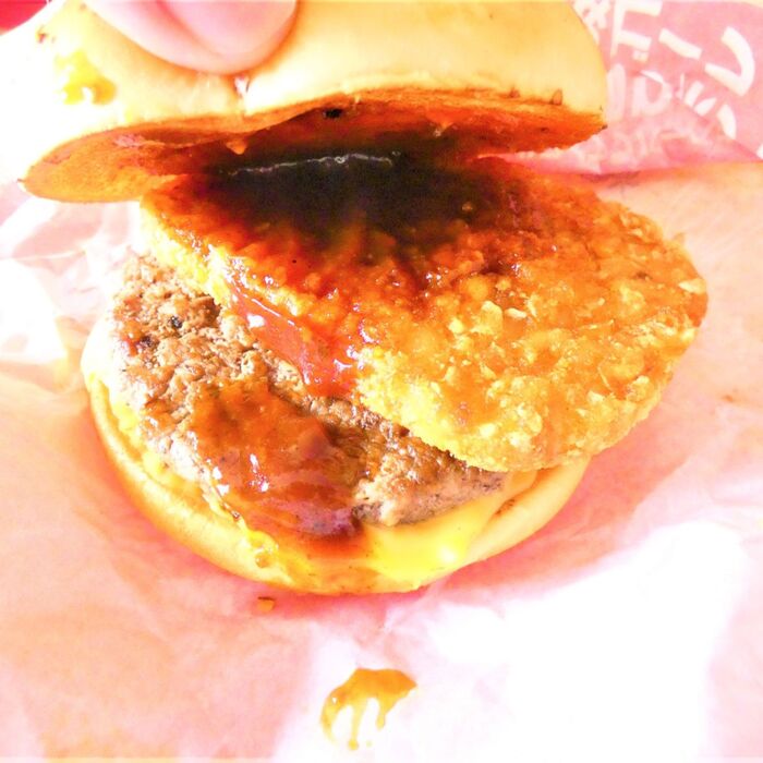 粉チーズをトッピングしたバンズの中には、チェダーチーズ・ビーフパティ・そして外カリッ中ほくほくのざく切りポテトフライが!!