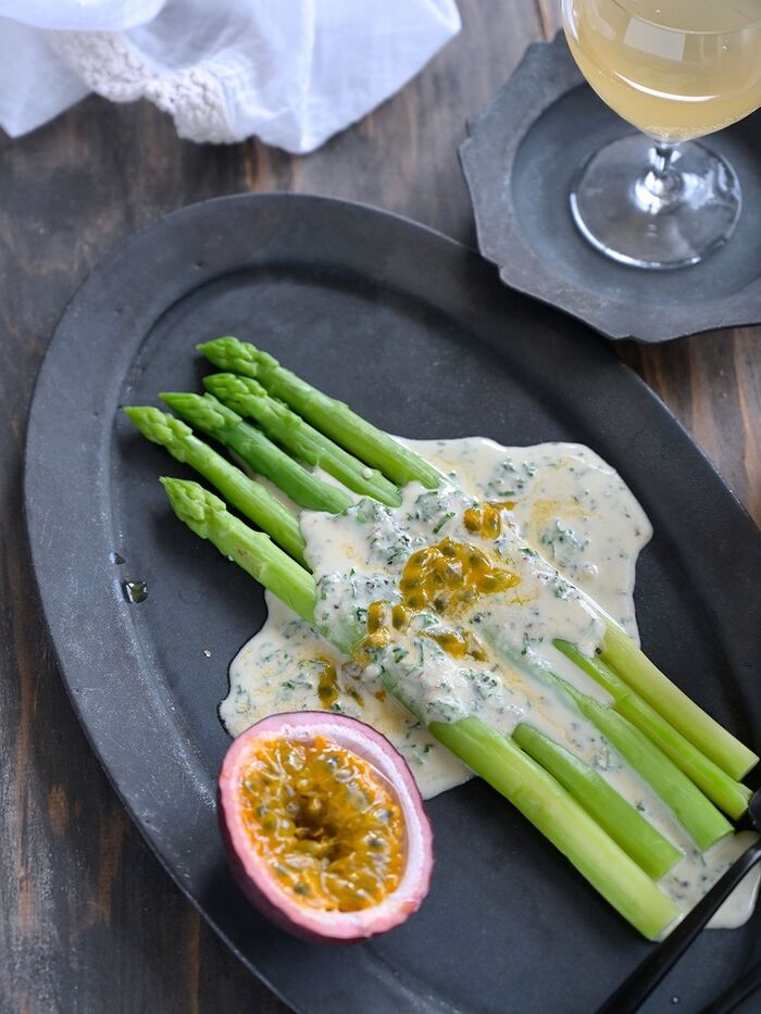 1:アスパラの固い部分を切り取り、下から3cm程をピーラーで剥き、塩を加えた熱湯でさっと茹でる。