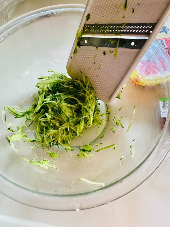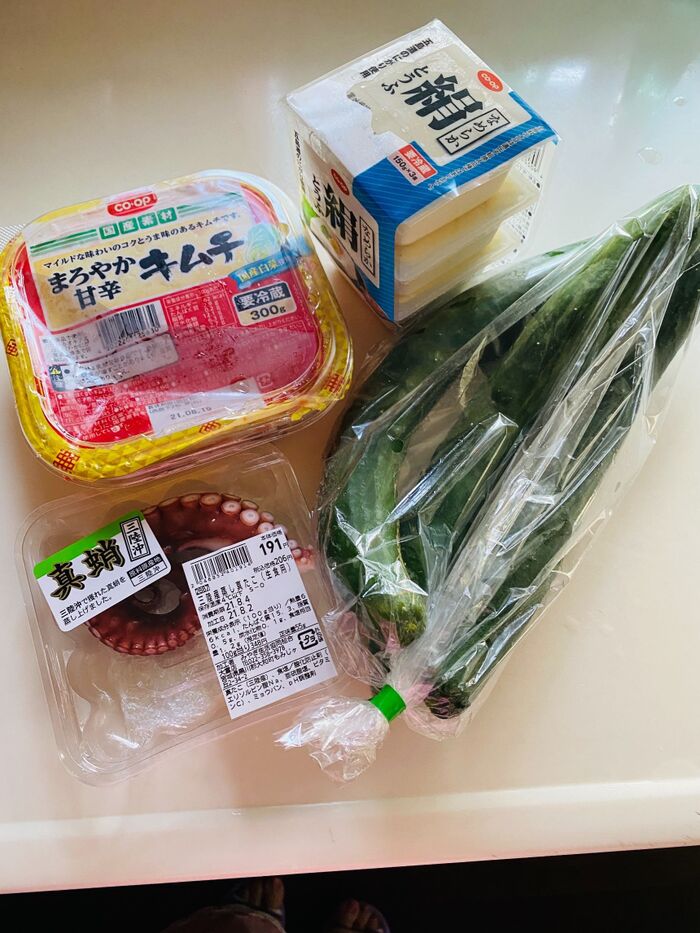 ボールに、先ほどスライスした胡瓜の水気を切り、スライスした蛸、キムチをいれ