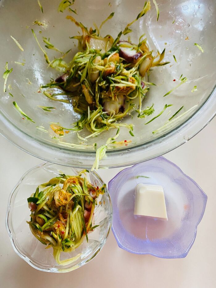 蛸キムチを仕上げます。絹どうふは4等分にします。小鉢に盛り付けます。