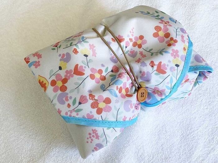 ランチクロスにはゴムとボタンがついているので、容器を包んだらぐるりとゴムをまわして止めることができます。