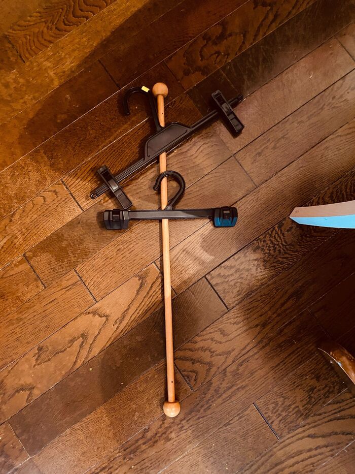 突っ張り棒の中心に合わせてズボンのハンガーを貼ります。