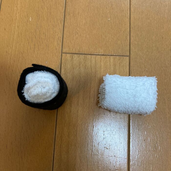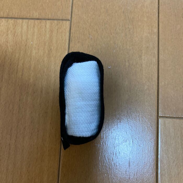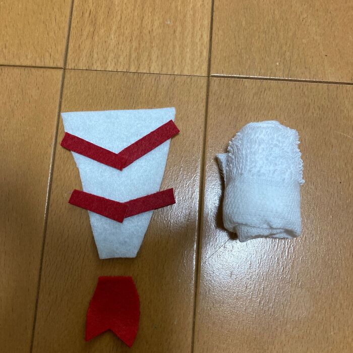 6等分にしたタオルをさらに半分にカットし、三つ折りにしてクルクル巻いて、フェルトの海苔、4センチ幅、長さ10センチぐらいのものを巻いて、細巻寿司、横に使って、握りのシャリにする。
