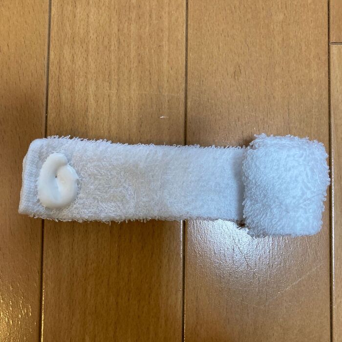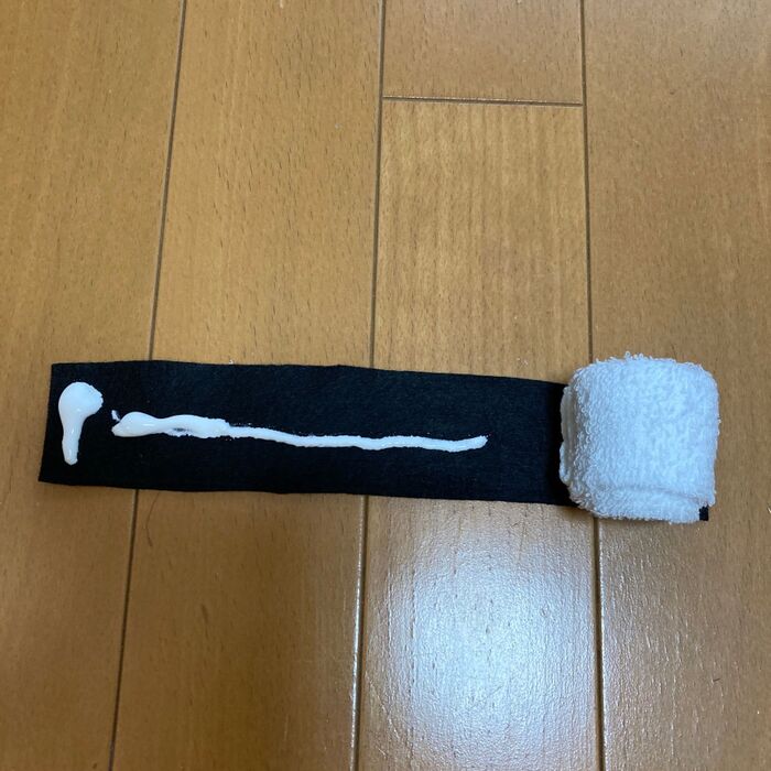 巻いたタオルをボンドで端を止め、フェルトの海苔を、幅4センチぐらい、長さ20センチぐらいに切って、海苔巻きのように、ボンドを付けて巻いていく。