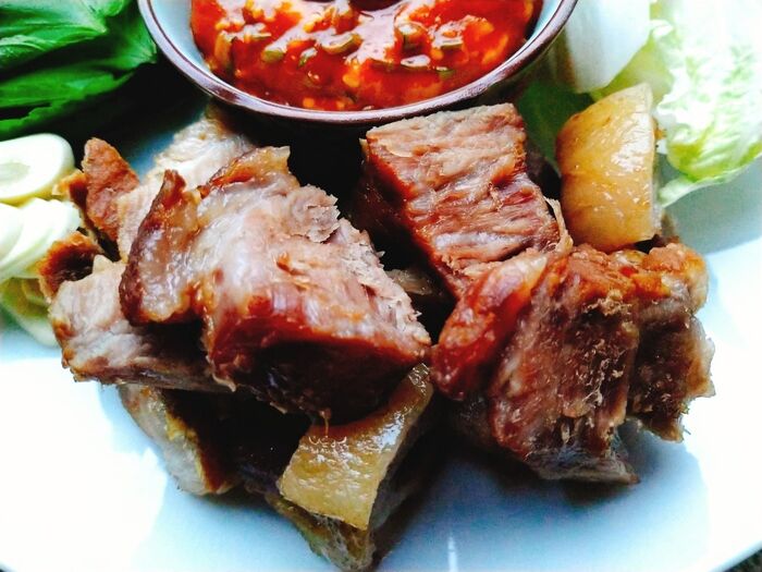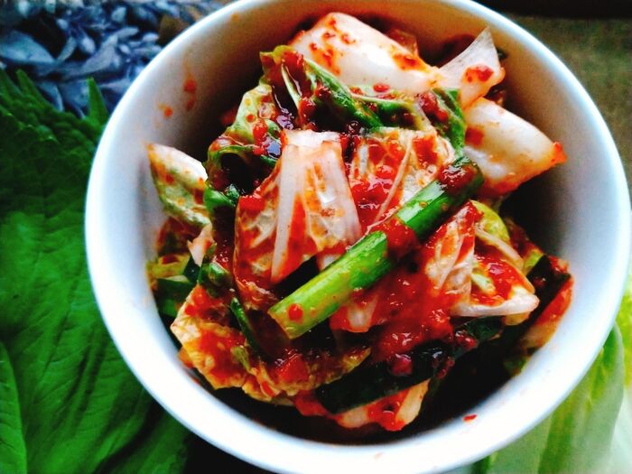 豚肉を葉野菜にのせ、キムチ、にんにく、タレをのせて巻いて一口で食べましょう!