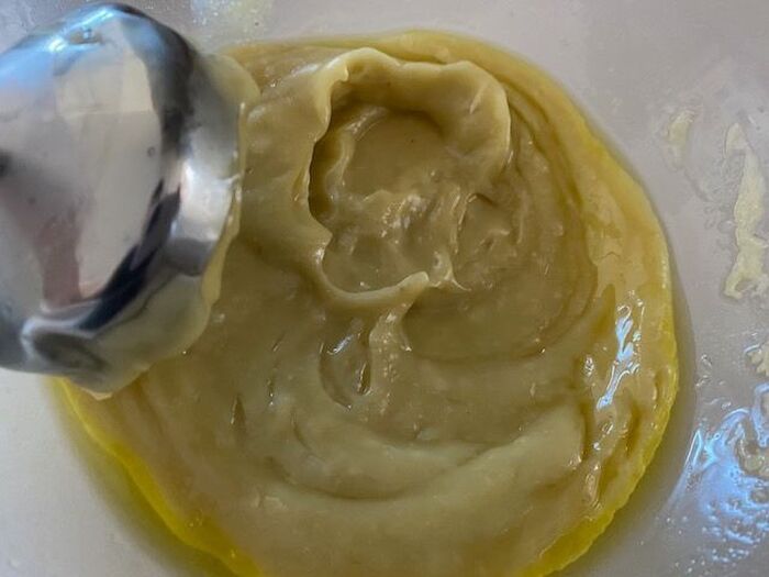 オリーブオイルと白だしを加え ハンドミキサーなどでピュレ状にして焼くときに加えた塩で味を調える
