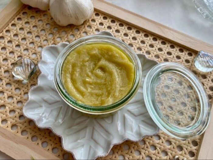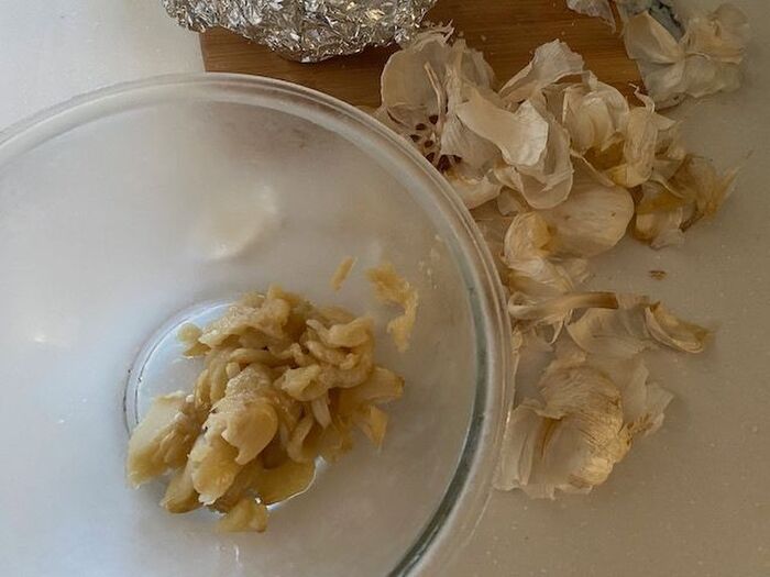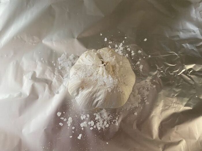 皮付きのにんにく丸ごとに 塩(粒岩塩を使っています)をふりアルミホイルに包み160℃のオーブンで約40分ぐらいじっくり焼く