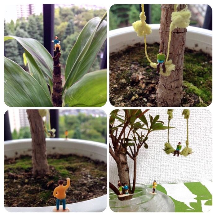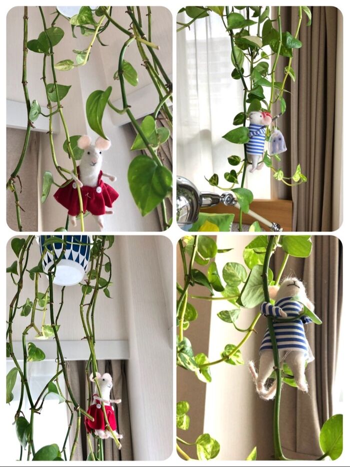なんだかジャックと豆の木みたいだなぁ、と棚に飾っていたねずみさん達をのぼらせてみました。