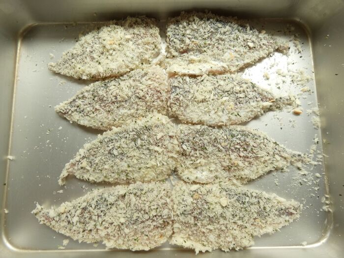 ★印の材料を混ぜ合わせ、アジに衣をつけます。