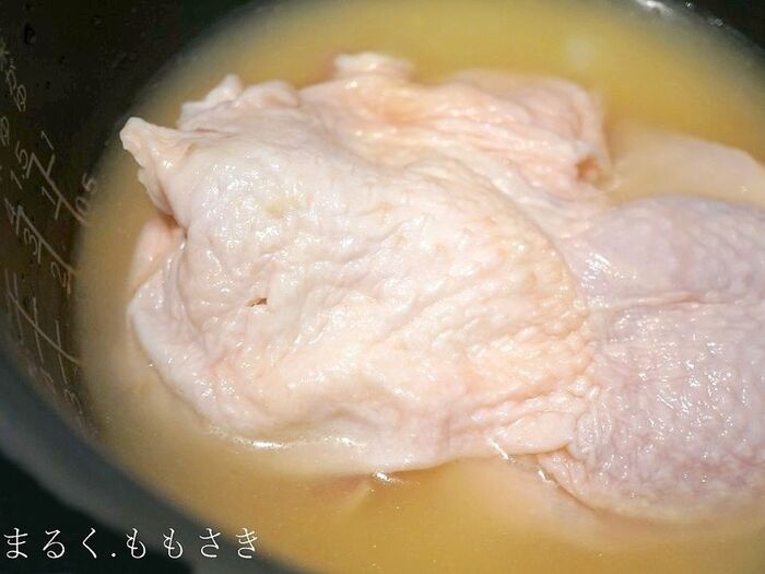ご飯の素を混ぜたら、鶏もも肉300gを入れ、早炊きでは無く、