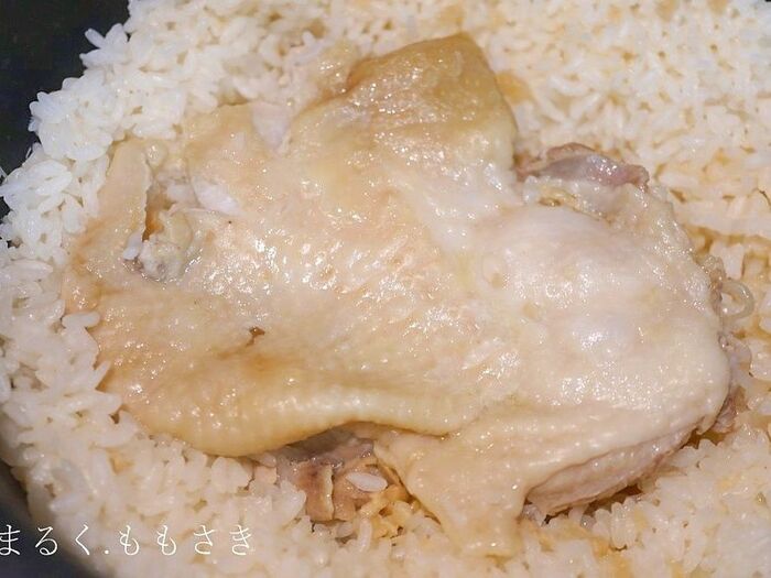 鶏肉を適当に切り、ご飯の上に乗せます。