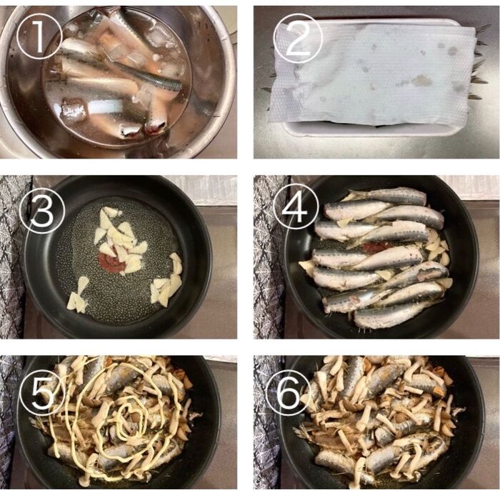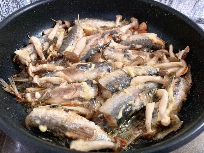 ⑥ しっかり火が通るまで、イワシの両面を焼きます
