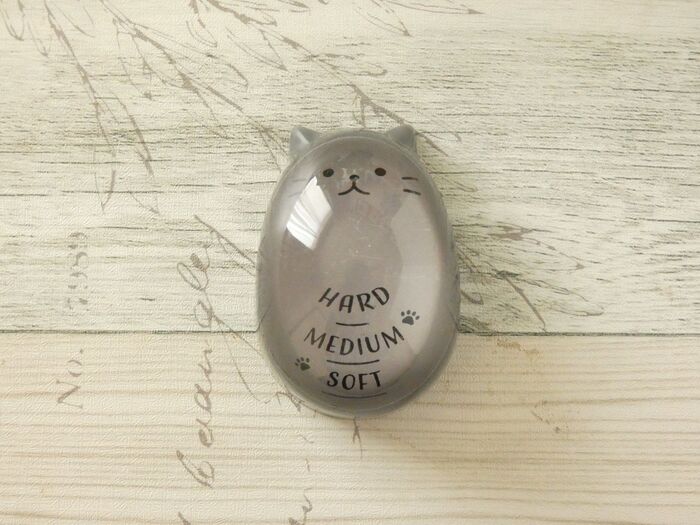 可愛いネコのエッグタイマーで、好みの固さのゆで卵が作れます。「SOFT」は黄身がトロトロの半生、「MEDIUM」は半熟、「HARD」は固ゆでになります。