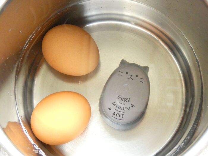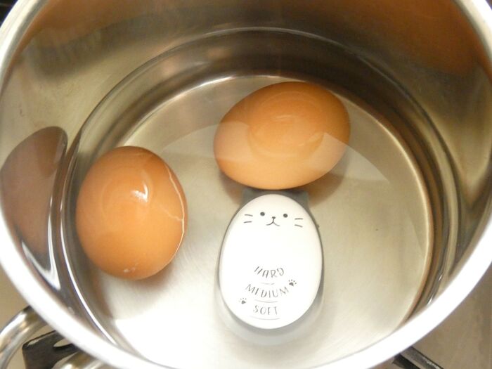 使い方は簡単で、卵とエッグタイマーを一緒に水に入れて中火にかけます。好みの固さまで色が変わったら火を止めて冷水で冷やせばOK。