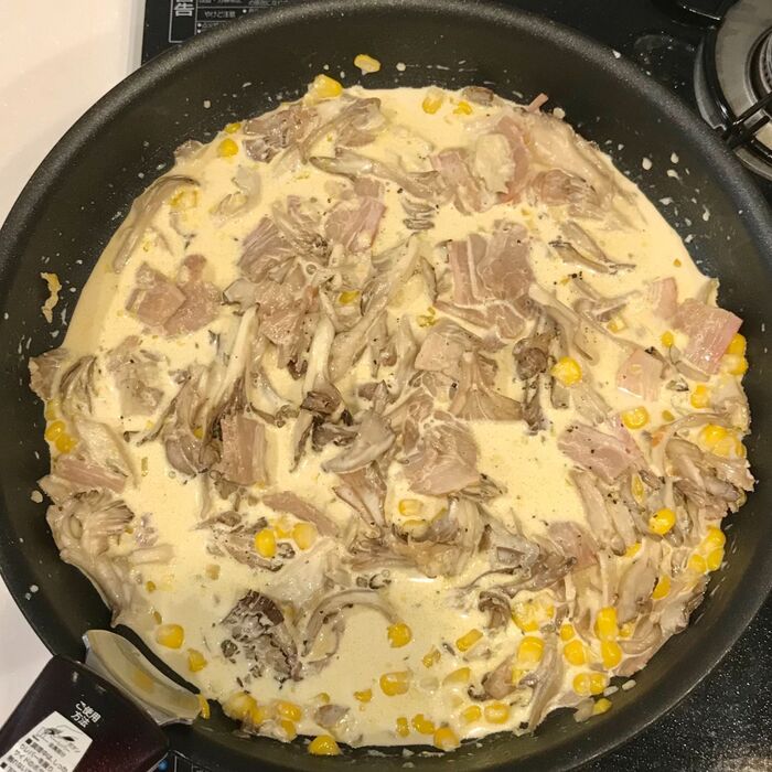 水気を切ったペンネも入れ、クリームソースを絡める。