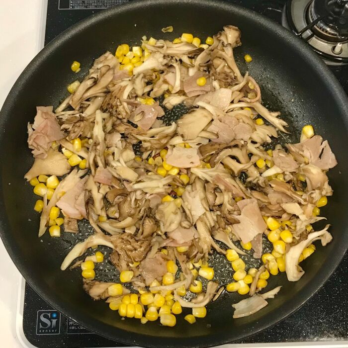 ベーコンは無塩せきの薄めのベーコンを使っているため、火の通りが早いので、舞茸、とうもろこしと一緒に炒めています。