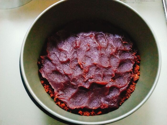 8.冷やしていたボトムの上に周り1㎝あけて小豆を敷き詰める