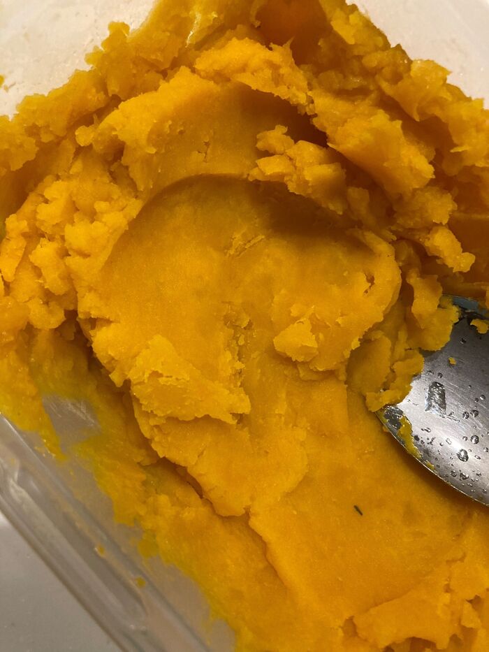 茹でたかぼちゃを用意します。実の部分だけを容器に移し、スプーンの背で潰します。