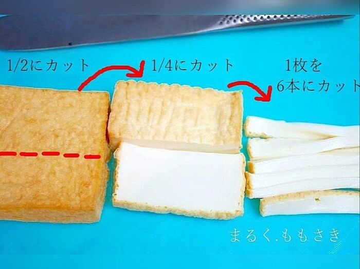まず1/2にカットして→さらに1個を横にカットする(4枚になる)