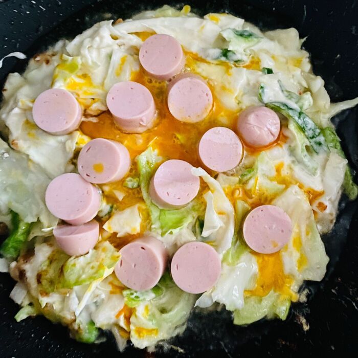 その上に、卵、輪切りにした魚肉ソーセージをのせます。