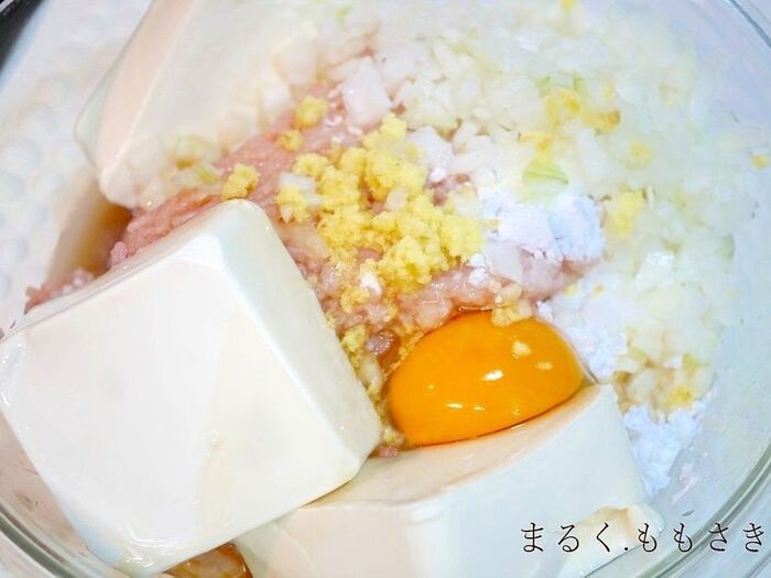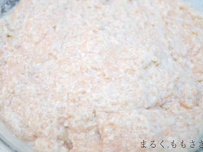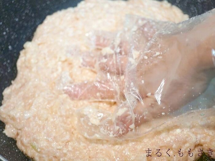 ボウルに鶏ひき肉を入れる。〈3パックをドン、ドン、ドンと積みましたw)