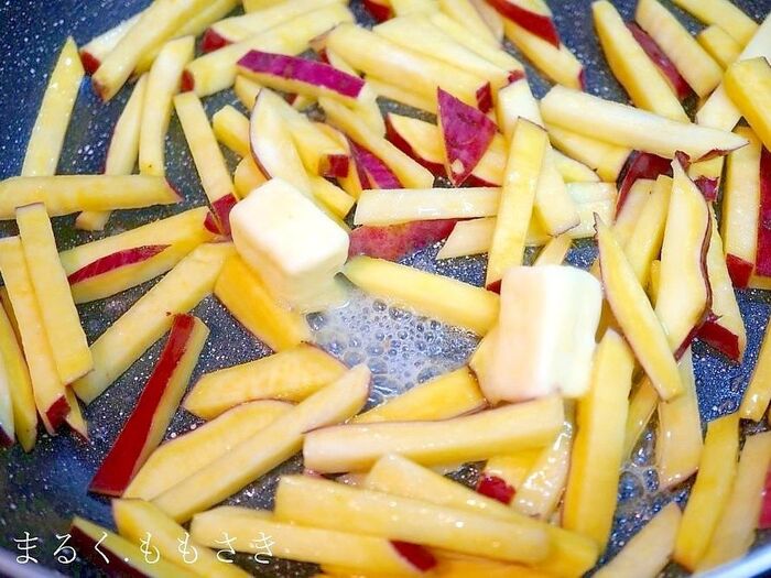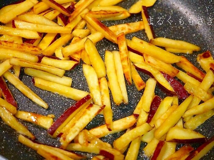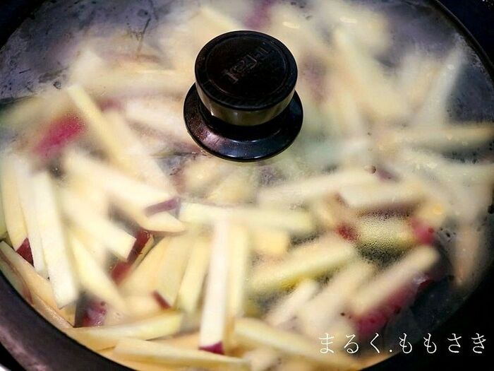 ①フライパンに水を切ったさつま芋を広げて入れ★の水を入れ、