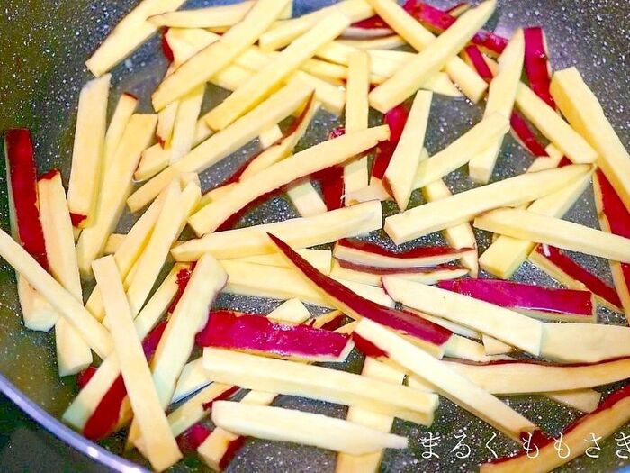 ●さつまいもはしっかり洗い皮ごと7ミリ程にカットし、