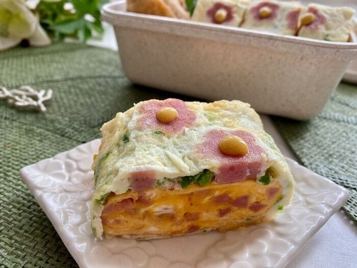 花型ハムが動かないようにそっと卵白の生地を流し込み 卵白が固まってきたら