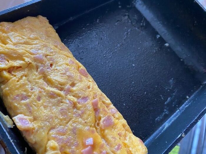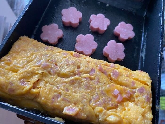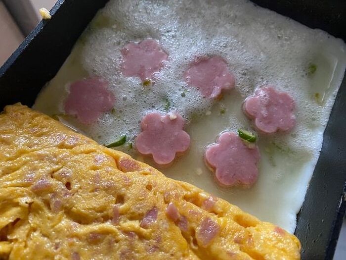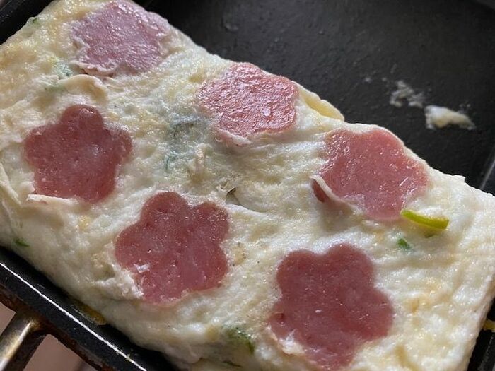 卵焼き器にオイルをまんべんなくまぶしハムを加えた卵液の半量を流し込み