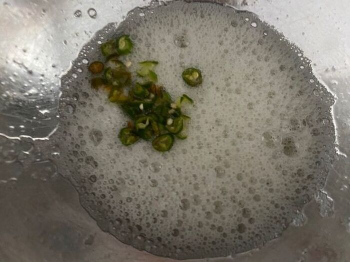 卵白の方は 塩・コショウしてからよく混ぜ合わせ 刻んだ青唐辛子を加える