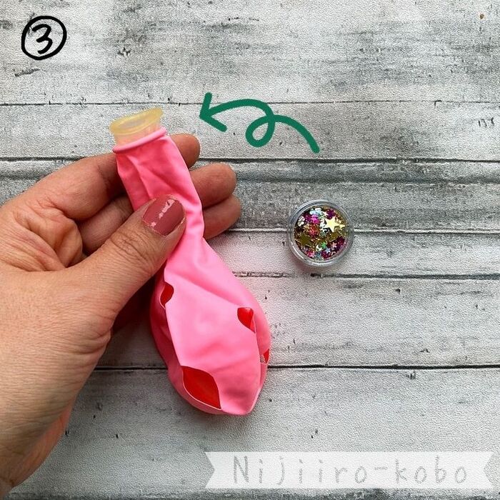 ③透明風船の中にラメを入れる。(多めに入れた方が仕上がりが綺麗。)