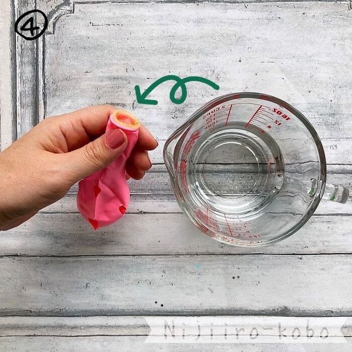 ④次に、透明風船の中に水を入れる。(口を結んだ際に溢れない程度の水の量でOK。)