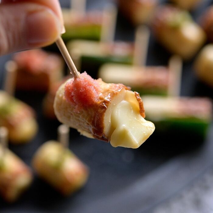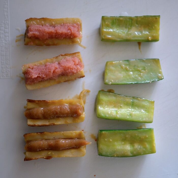 3:Aチームのちくわの溝に明太子と梅チューブをそれぞれ詰め、