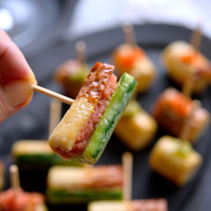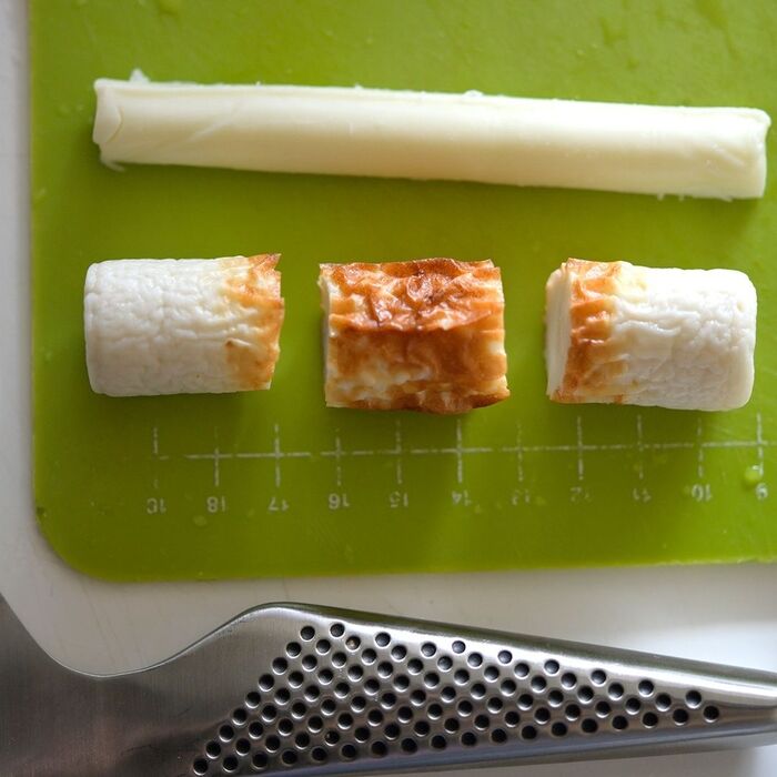 2:さけるチーズを半分にさき、3等分に切りちくわの穴に詰める。