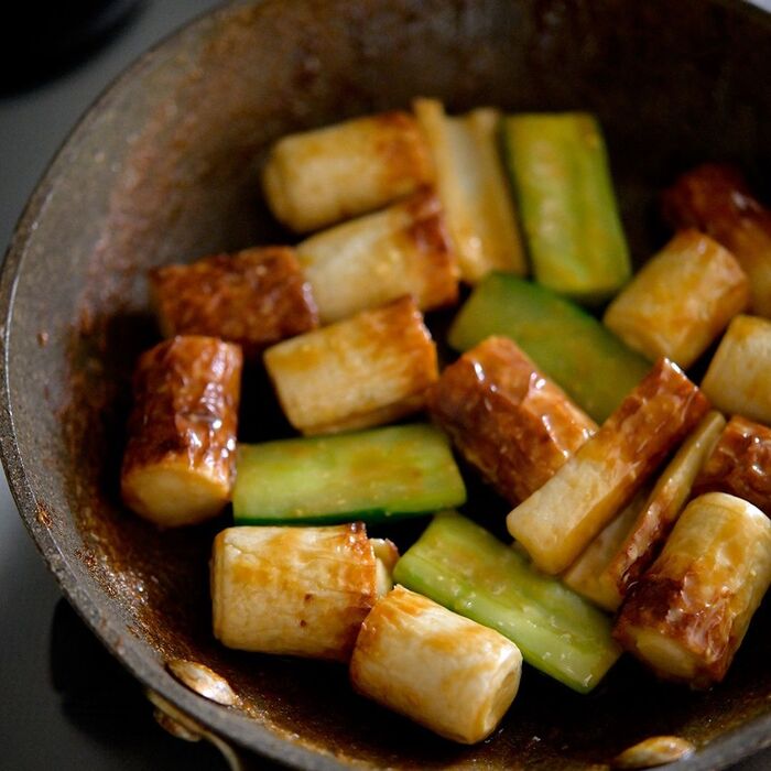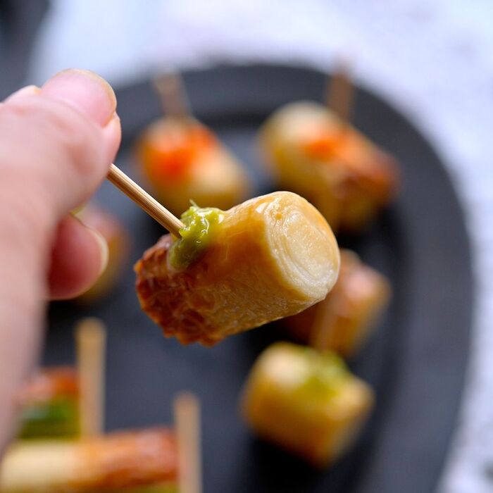 1:長芋の角っこを少々丸く整え、ちくわの穴に詰める。