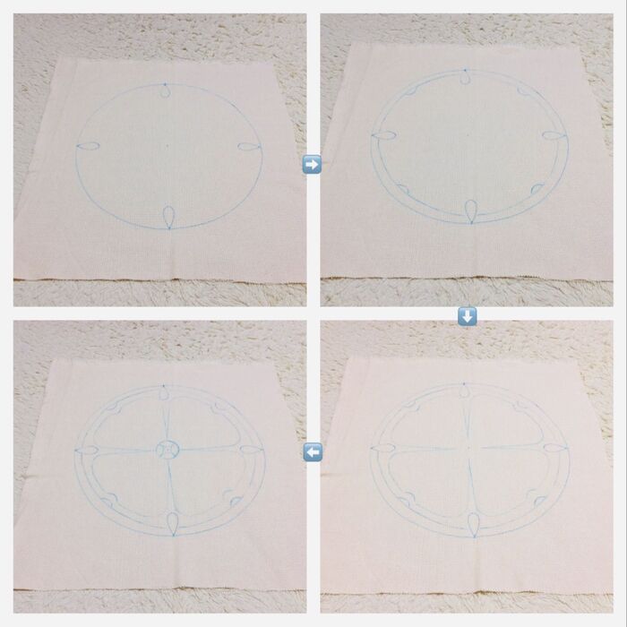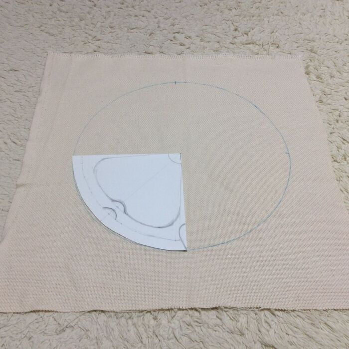 ①土台布に作りたいクッションの輪郭線を描きます。大きさにもよりますが、コンパスを使ってみてもOK!ここでは、円形の型紙を作ってから、その輪郭線に沿ってペンで描きました。